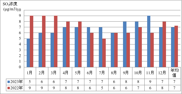 二氧化硫(SO2):二氧化硫的日平均濃度范圍為3~10μg/m3,年平均濃度為7μg/m3,和2022年持平,見圖3-3。按年平均二級(jí)濃度限值(60μg/m3)評(píng)價(jià),年評(píng)價(jià)為達(dá)標(biāo)。日均值第98百分位數(shù)為10μg/m3,按24小時(shí)平均二級(jí)濃度限值(150μg/m3)評(píng)價(jià),年評(píng)價(jià)為達(dá)標(biāo),日評(píng)價(jià)為全年無超標(biāo)天數(shù)。