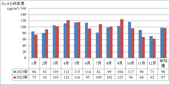 臭氧(O3):臭氧的日最大8小時(shí)平均的濃度范圍為9~224μg/m3,年平均濃度為98μg/m3,比2022年上升1.0%,見圖3-6。日最大8小時(shí)平均濃度第90百分位數(shù)為139μg/m3,按照日最大8小時(shí)平均二級(jí)濃度限值(160μg/m3)評(píng)價(jià),年評(píng)價(jià)為達(dá)標(biāo),日評(píng)價(jià)為全年超標(biāo)12天,超標(biāo)率3.3%。