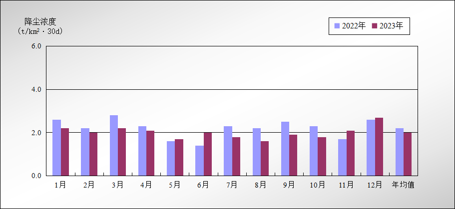降塵:降塵的月均濃度范圍為1.6~2.7?t/km2·30d,均達(dá)到省定標(biāo)準(zhǔn),達(dá)標(biāo)率100%。年均值為2.0t/km2·30d,低于《浙江省人民政府關(guān)于印發(fā)浙江省打贏藍(lán)天保衛(wèi)戰(zhàn)三年行動(dòng)計(jì)劃的通知》(浙政發(fā)[2018]35號(hào))中對(duì)降塵量的要求(5.0 t/km2·30d),相比2022年有所下降,具體見圖3-9。